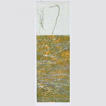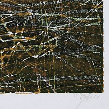 Abstrakte Komposition. Ungedeutet unten rechts signiert. Sehr schöner Farbholzschnitt in ungewöhnlichem Format. Blattformat: 63,5 x 21,8 cm. Abbildung: 54 x 18 cm. Minimale Gebrauchsspuren, schöner Zustand. Leider konnte die Signatur bislang nicht entschlüsselt werden. Entstehung wohl 2001. Abbildung zwei ist natürlich nur für die Signatur gedacht.