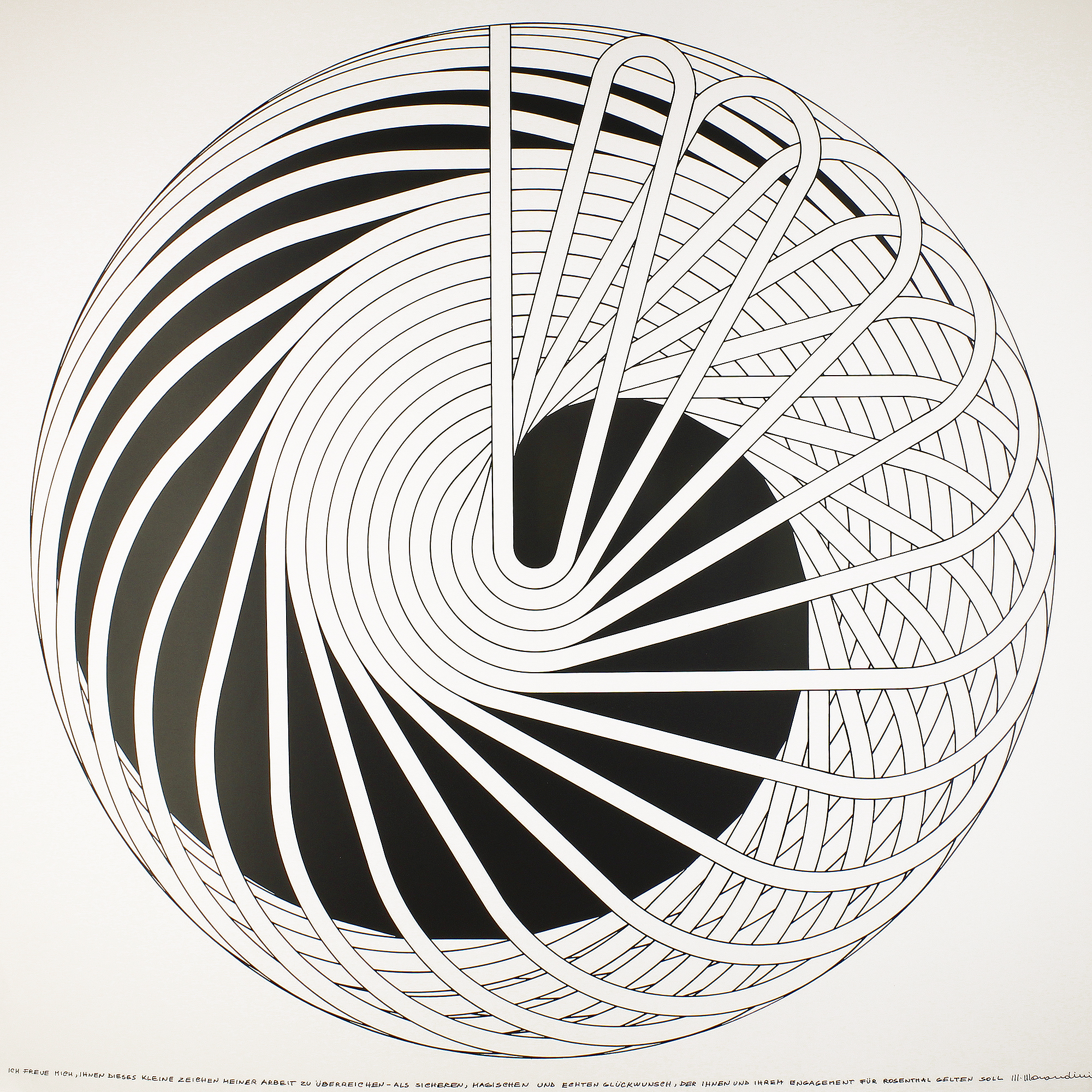 Marcello Morandini. Geometrische Komposition. Serigrafie. Blattformat: 50 x 50 cm. Auf leichten Karton gedruckt. Entstehung dürfte in den 70er Jahren sein.Gedruckte Danksagung am unteren Rand: Ich freue mich, Ihnen dieses kleine Zeichen meiner Arbeit zu überreichen - Als sicheren Magischen und echten Glückwunsch, der Ihnen und Ihrem Engagement für Rosenthal gelten soll. M. Morandini. Schöner Zustand.