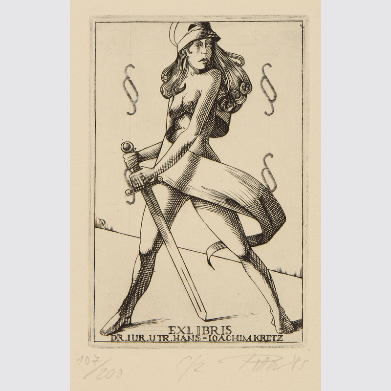 Erotisches Exlibris für Hans-Joachim Kretz. Radierung. Blattformat: 14 x 9,5 cm. Abbildung: 10 x 6,5 cm. Guter Zustand. Unter der Abbildung undeutlich signiert (Potter?).