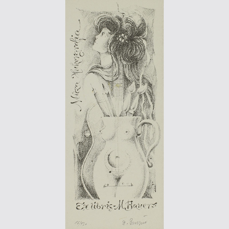 Erotisches Exlibris für M. Bauers. Undeutlich signiert, nummeriert Exemplar 16/130. Blattformat: 11 x 4,8 cm. Guter Zustand.