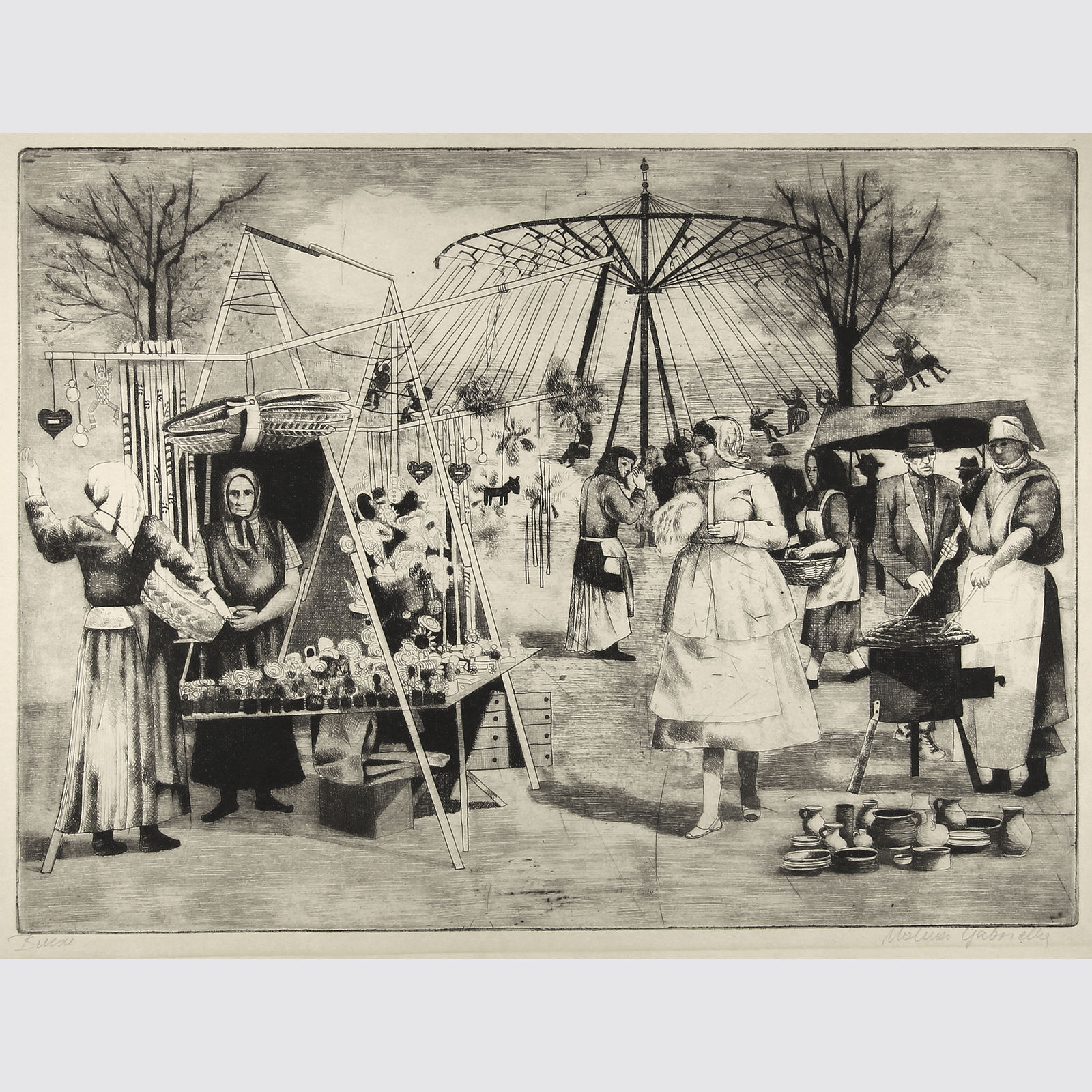 Reges Treiben auf dem Jahrmarkt. Sehr schöne Originalradierung, leider undeutlich signiert Gabrielly(?). Abbildungsformat: 29,2 x 39,5 cm. Blattformat: 42 x 59 cm. Zustand: im ehemaligen Passepartoutbereich etwas gebräunt, leichte Druckstellen bzw. leichte Knicke außerhalb der Darstellung, insgesamt guter Zustand.