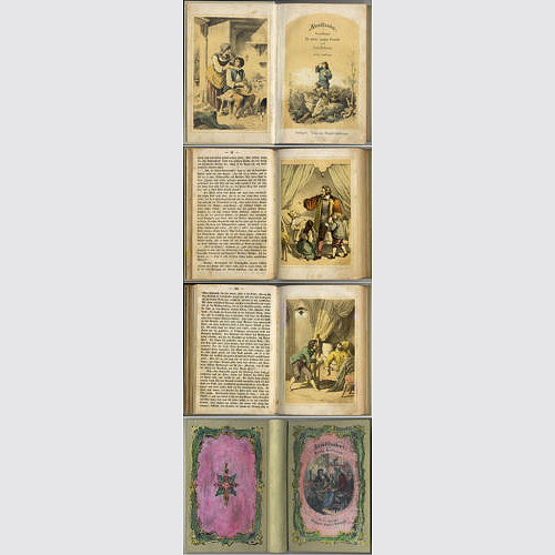 Abendstunden. Erzählungen für meine jungen Freunde von Klaus Hoffmann. Dritte Auflage (1856). Stuttgart Verlag von Eduard Hallberger. Umfang: 359 Seiten. Mit fünf kolorierten Lithographien. Zustand: neu eingebunden in schlichtem Pappeinband mit aufkaschieren Originalumschlägen in Fotokopie. Innen durchgehend leicht stockfleckig und etwas eng beschnitten. Insgesamt noch recht guter Zustand.