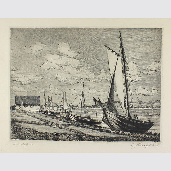 Erhard Langkau: Fischerhafen mit Boten. Originalradierung, unten links bezeichnet, rechts signiert. Format der Abbildung: 18 x 24 cm. In schönem Holzrahmen mit Goldleiste unter Passepartout. Format des Rahmens: 32,5 x 38 cm. (Rahmen nur Beigabe.). Minimale Gebrauchsspuren, schöner Zustand.