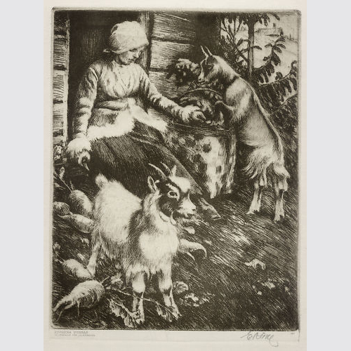 Ernst Nicolaus Küsel (1873-1942). Ziegenmagd um 1920. Heliogravüre. Format: 18,5 x 25 cm. Unten rechts signiert E. Küsel. Schöner Zustand.