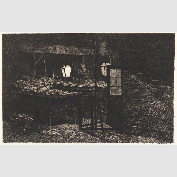Sehr schöne Original-Radierung „Böhmische Obst-Handlung“ (so in der Radierung auf Schild beschriftet). Leider unsigniert, Künstler unbekannt. Abbildung: ca. 14,2 x 22 cm. Blattformat: 36,5 x 46 cm. Zustand: teils etwas fleckig, unterer weißer Rand mit Wasserfleck (nicht störend da sehr breitrandiges Exemplar), Abbildung selbst in sehr schönem Zustand.