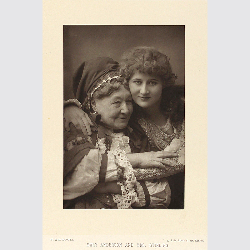William und Daniel Downey: Originalfotografie um 1885. Albuminabzug auf Karton montiert. Mit Eindruck des Studios und Londoner Adresse versehen. Marry Anderson and Mrs. Stirling. Format der reinen Aufnahme: 9,2 x 14 cm (Kartonformat: 16,2 x 23 cm). Sehr guter Zustand.