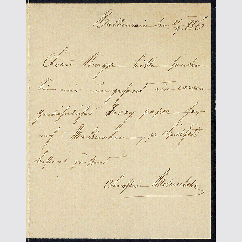 Therese Fürstin zu Hohenlohe-Waldenburg-Schillingsfürst (1816-1891), Gattin von Fürsten Friedrich Karl I. Joseph zu Hohenlohe-Waldenburg-Schillingsfürst. 1seitig beschriebener Brief mit der Bitte um Besorgung von Papier..., datiert 1886.