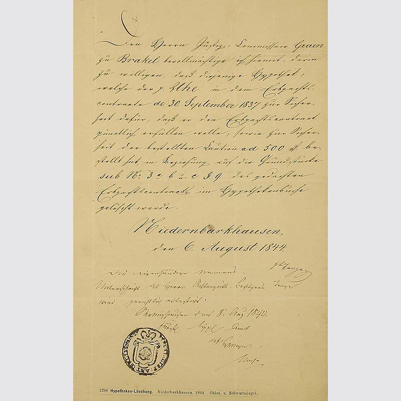 2seitiges Dokument: Hypotheken-Löschung von 1844 - Niederbarkhausen. Oblatensiegel und Schwarzsiegel.