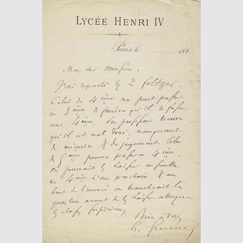 Handschriftlicher Brief auf Briefkopf der Lycée Henri IV, Paris ca. 1880-1889..