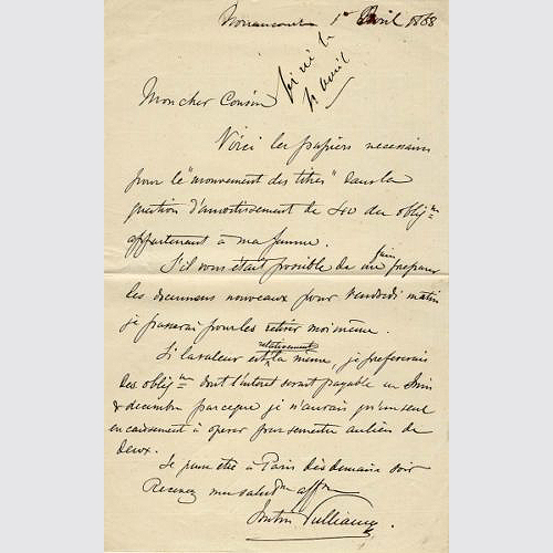 Einseitiger Brief, datiert 1868. Justin Vulliamy Frères. Briefkopf mit Wasserzeichen. Fabrikant von Textilerzeugnissen in Paris.