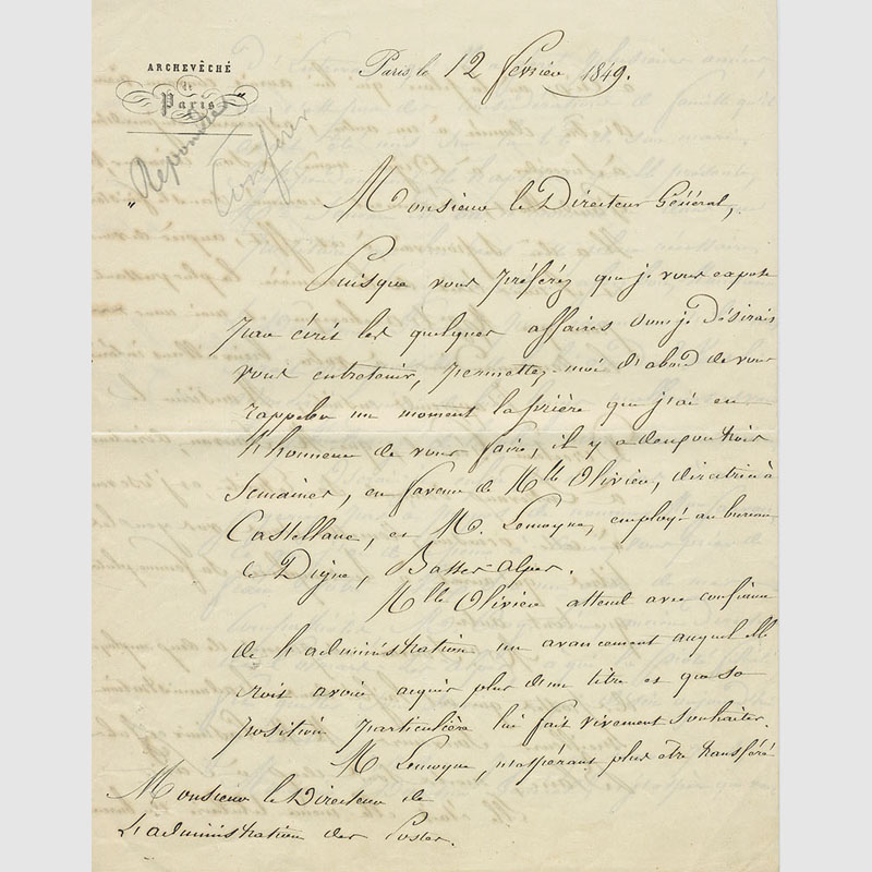 Archeveche de Paris. Umfangreicher, 4seitiger Brief, datiert 1849.