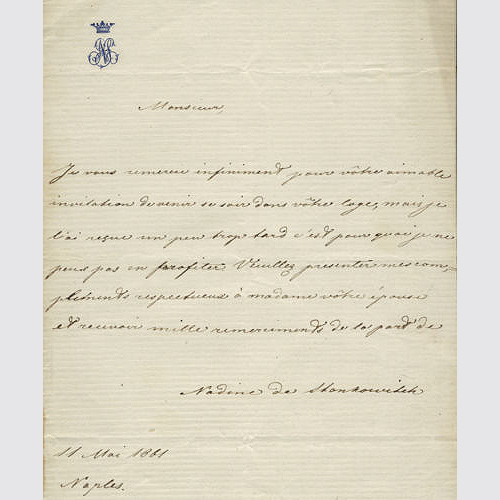 Brief von Nadine de Stonkowitch an Alfonso Kardinal Capecelatro di Castelpagano CO (* 5. Februar 1824 in Marseille, Frankreich; † 14. November 1912 in Capua, Italien) Erzbischof von Capua und später Kurienkardinal. Der aus einer neapolitanischen Adelsfamilie stammende Capecelatro trat in den Orden der Oratorianer ein, wurde 1878 Vizebibliothekar des heiligen Stuhls, 1880 Erzbischof von Capua und 1885 Kardinal durch Leo XIII.