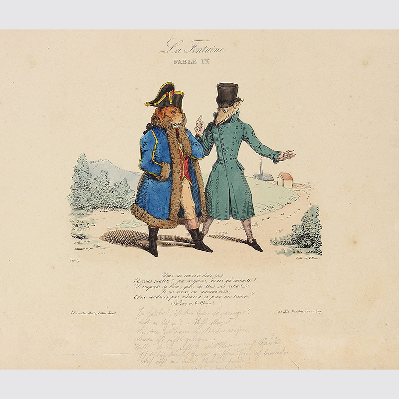 Herrliche Karikatur - La Fontaine Fable IX - Vous ne courez donc pas... Entwurf von Levilly, Lithografie von Villain. A Paris, chez Dauty, Palais Royal. Um 1820. Handkolorierte Lithografie. Abbildungsformat mit Schrift: ca. 19,5 x 18 cm. Zustand: leichte Gebrauchsspuren, etwas angestaubt bzw. fleckig, im unteren Bereich handschriftliche Anmerkungen mit Bleistift, noch guter Zustand.