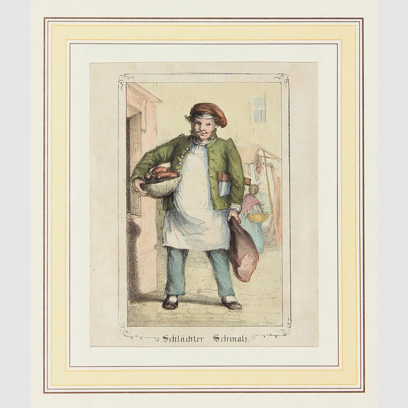 Schlächter Schmalz. Kolorierte Lithografie um 1820. Abbildungsformat: 11,6 x 7,5 cm. Blattformat: ca. 14 x 10,2 cm. Hinter Passepartout montiert. Zustand: etwas fleckig, guter Zustand.