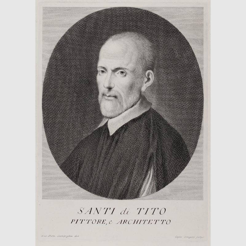 Kupferstich: Santi di Tito (Maler und Architekt, Italien) - Gestochen von Carlo Gregori / Entwurf von Giovanni Domenico Campiglia - Blattformat: 31,5 x 46,5 cm. Abbildungsformat: 17,5 x 25 cm (mit Schrift). Minimale Gebrauchsspuren, guter Zustand. Sehr schönes, breitrandiges Blatt. Entstehung um 1750.
