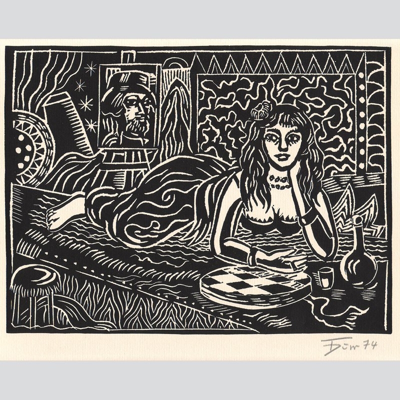 Thomas Dürr. Spanische Nacht. Linolschnitt. Blatt-Format: 23 x 32 cm. Mit Bleistift unten rechts signiert, datiert 1974. Schöner Zustand. Papier mit kleinem Prägestempel GK.