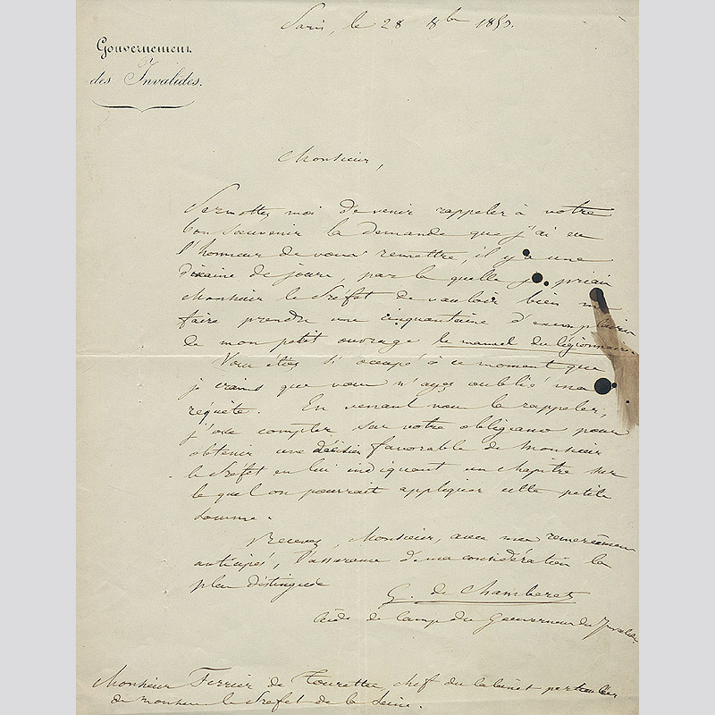Einseitger Brief, datiert 1853 - Briefkopf Gouvernement des Invalides - General de Chamberet