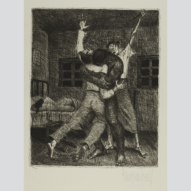 Eduard Baudrexel (1890-1968 München): Liebesdrama. (Im Hintergrund auf einem Bett liegender weiblicher Akt zu sehen). Originalradierung 1921. Auf Bütten gedruckt. Unter der Abbildung links mit Bleistift nummeriert Exemplar 50/100, rechts signiert. Blattformat: 50 x 41,8 cm. Abbildung: 22 x 17,7 cm. Sehr schöner Zustand der seltenen Arbeit. Die Arbeit stammt aus der Mappe Dreissig Jahre Münchner Radierverein 1922.