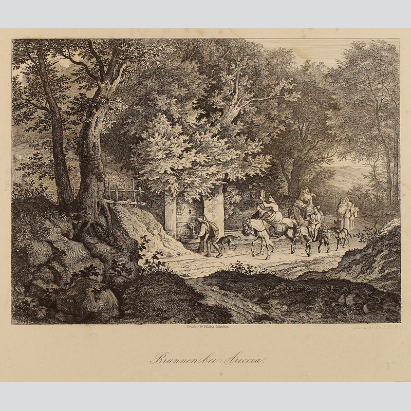 Adrian Ludwig Richter: Brunnen bei Ariccia. Radierung, auf kräftigem Kupferdruckpapier, 1831 (1875). Von Adrian Ludwig Richter. Abbildungsformat: 14,8 x 20,2 cm. Blattformat: 27 x 33 cm (wohl etwas beschnitten). Aus: Adrian Ludwig Richter, Landschaften von Ludwig Richter. - In der Platte rechts unten signiert "gem. u. gest. v. L. Richter." Mittig Druckeradresse Friedrich Felsing, München. Unterhalb gestochener Titel. Später originaler Abzug der schon 1831 für die "Bilderchronik" des Sächsischen Kunstvereins hergestellten Platte. Zustand: Blatt wasserfleckig, in der Abbildung nur etwas gebräunt und noch guter Zustand der schönen Ansicht (Wasserschaden stark im Preis berücksichtigt).