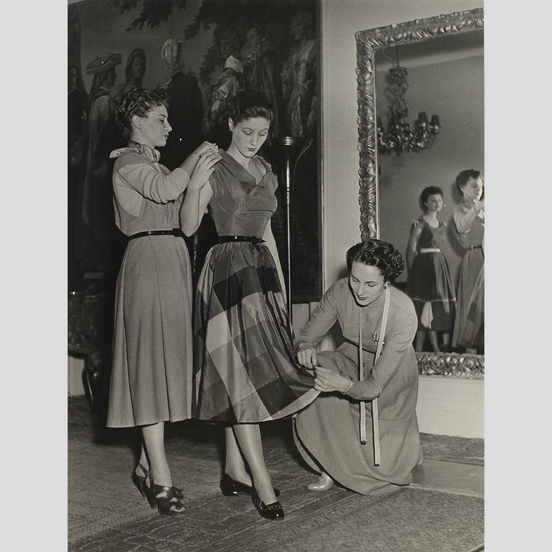 Bob Klebig: Sommer 1953, Modell Gloria. Susanne Erichsen Mode. Letztes Handanlegen am Rock. Sehr schöner Silbergelatine-Abzug. Format: 30 x 23 cm. Minimale Gebrauchsspuren, schöner Zustand der wunderbaren Aufnahme der 50er Jahre. Verso vom Fotografen gestempelt Bob Klebig, Berlin. Die Aufnahme stammt aus dem Modestudio Susanne Erichsen (s.u.). Rechts im Bild Susanne Erichsen zu sehen.