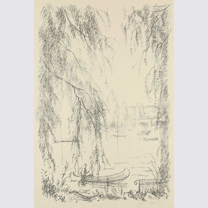 Friedrich Ahlers-Hestermann (1883 Hamburg – 1973 Berlin). Kahn auf der Außenalster – um 1939. Lithographie. Rechts unten signiert. Abbildung: ca. 41,8 x 28,5 cm. Blattgröße 50 x 39 cm. Ränder teils knickspurig, kleiner geklebter Einriß am Rand, Abbildung sebst guter Zustand.