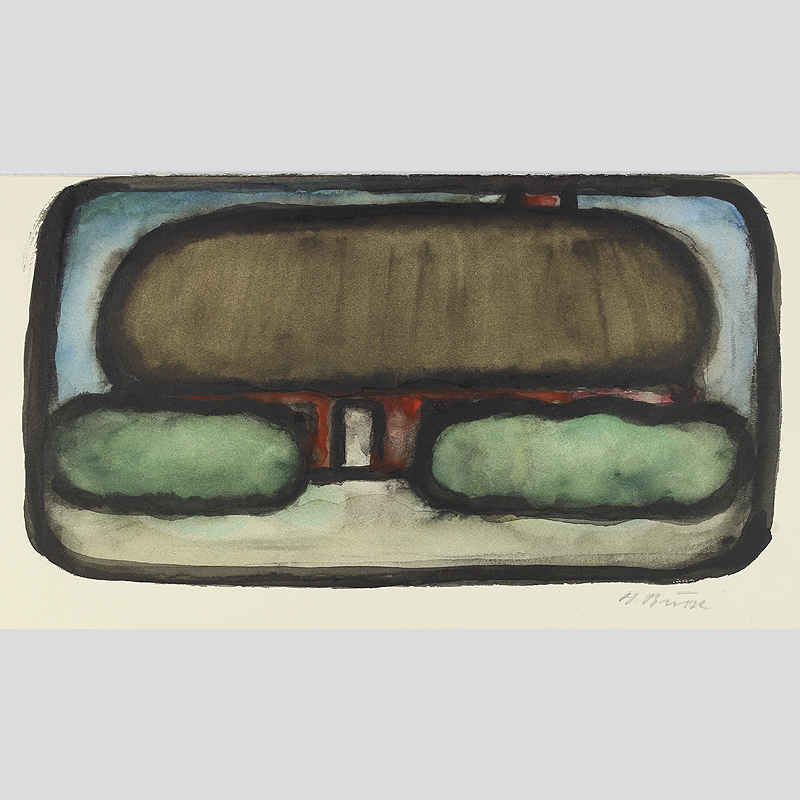 Hans Busse (*1904 Dresden). Abstrakte Hausansicht. Entstehung dürfte Anfang der 30er-Jahre gewesen sein. Unten rechts mit Bleistift signiert H. Busse. Aquarell-/Tuschezeichnung. Abbildungs-Format: 13,5 x 25 cm. Am oberen Rand bis and die Abbildung beschnitten, ansonsten guter Zustand der wunderbaren Arbeit.