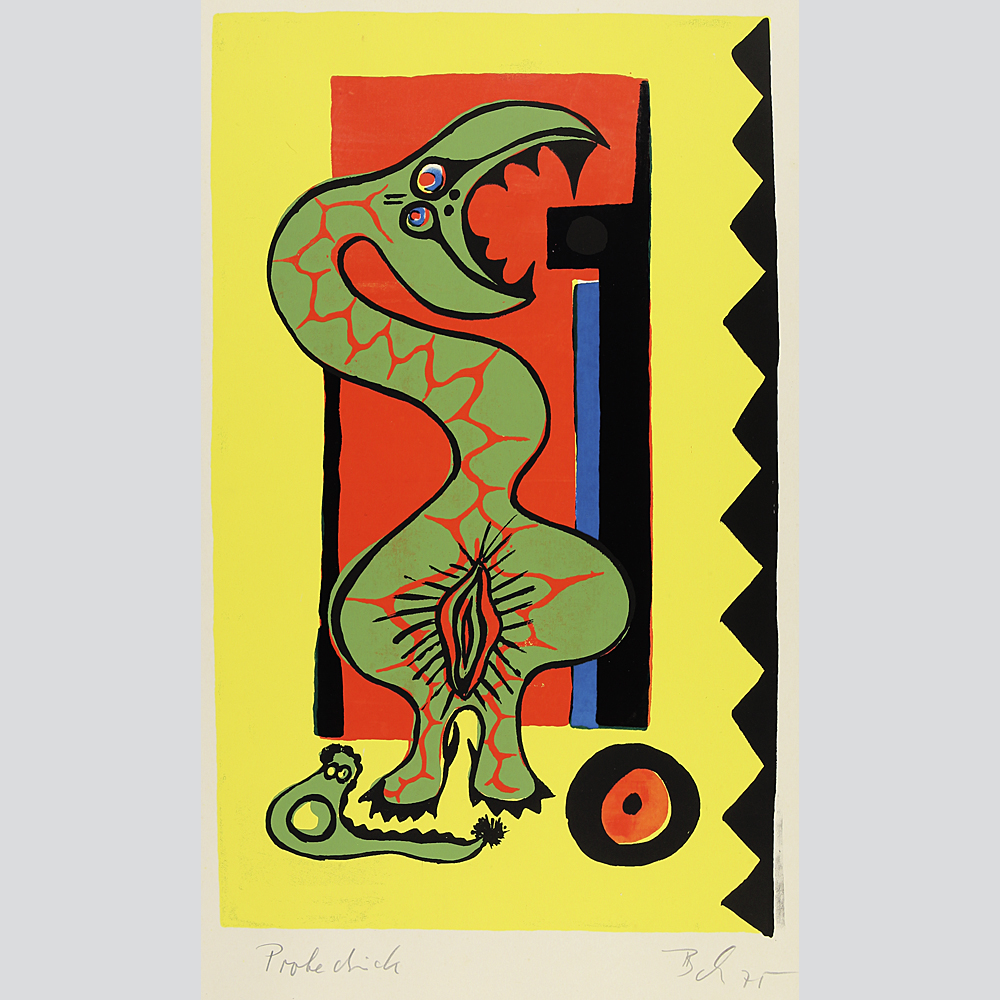 Beh: Skurriles Fabelwesen. Farbholzschnitt 1975. Typische Arbeit der 70er Jahre. Unter der Arbeit rechts signiert Beh (zum Künstler konnte bislang nichts weiter eruiert werden, bitte beachten Sie weitere eingestellte Arbeiten des Künstlers), datiert 1975, links als Probedruckt bezeichnet. Abbildungsformat: 30 x 18,2 cm. Blattformat: 43,2 x 30,5 cm. Leichte Gebrauchsspuren, guter Zustand.