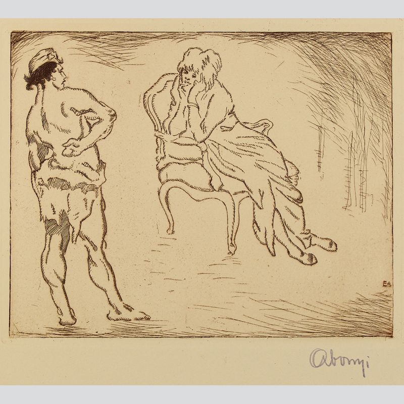 Erno Abonyi (1888-1941 Budapest). Die Begutachtung. Radierung in rötlichem Braunton. Im Druck monogrammiert, unten rechts handsigniert. Entstehung um 1920. Breitrandiges Exemplar. Abbildungsformat: 15 x 18,6 cm. Blattformat: 32,7 x 43,2 cm. Minimale Gebrauchsspuren, schöner Zustand.