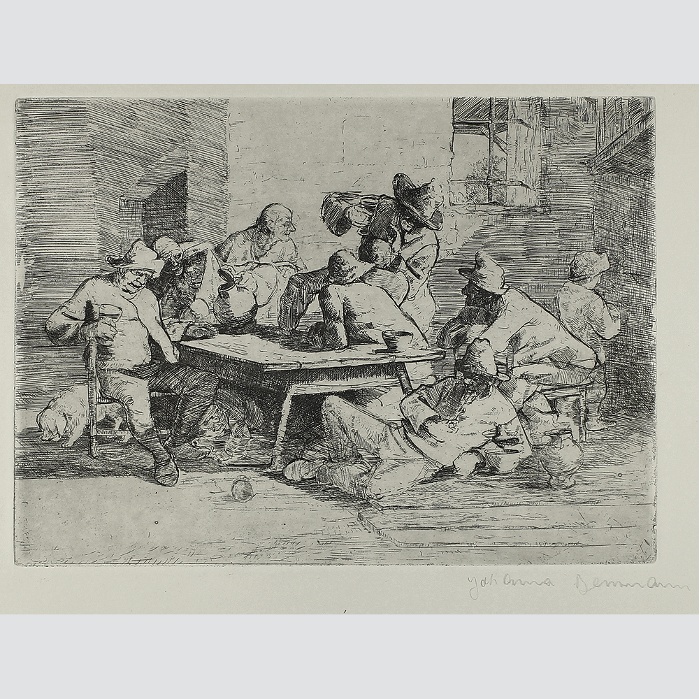 Johanna Bammann: In der Schenke. Wirtshausszene. Radierung 1930. Blattformat: 25 x 34,5 cm. Abbildung: 15,5 x 21,2 cm. Herausgegeben von der Balder-Presse. Verso mit kleiner Verlags-Nr. versehen (141). Minimale Gebrauchsspuren, schöner Zustand.