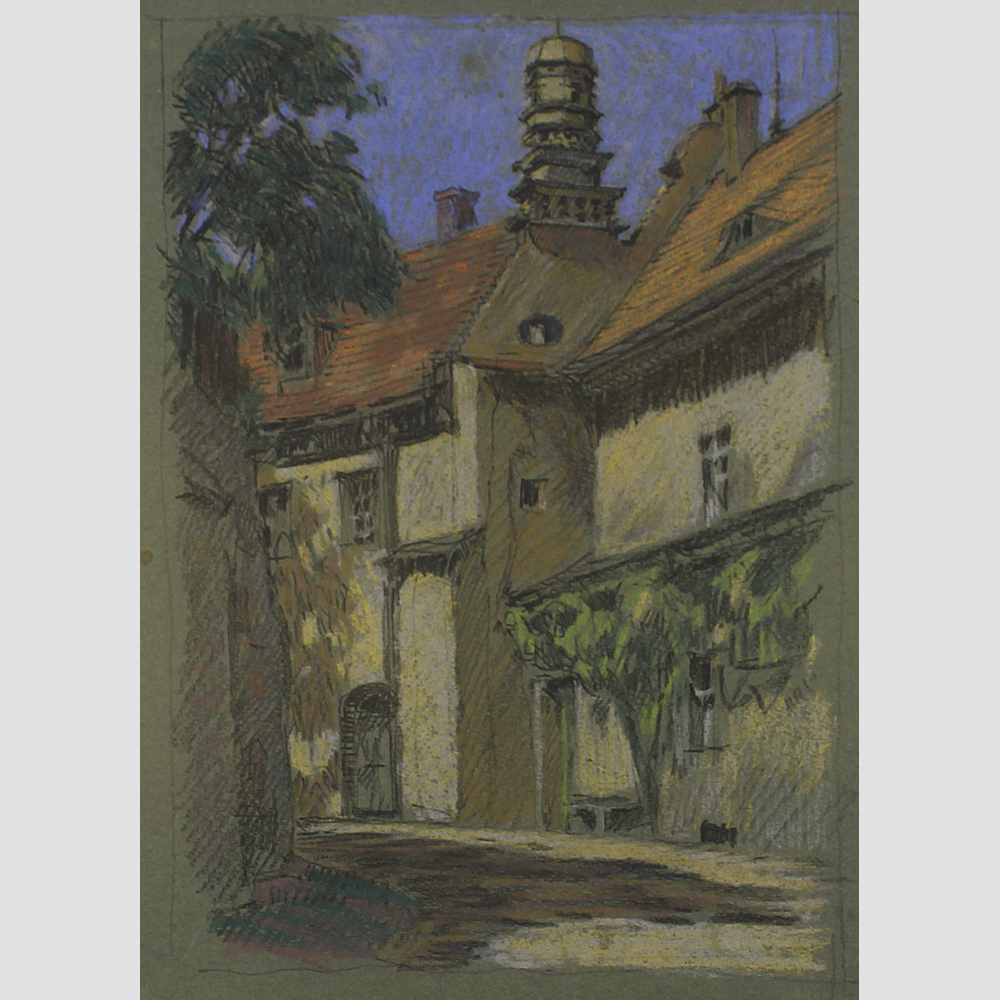 Rudolf Veit: Meissen. Dorfstraße. Sehr schöne Pastellzeichnung 1921. Unsigniert, aus gleicher Sammlung wie die anderen Arbeiten von Veit stammend. Also mit Sicherheit ein Original von Rudolf Veit. Abbildung: 23 x 16,5 cm. Blattformat: 32,5 x 22 cm. Auf dunkelgrünem Papier gemalt. Zustand: Untere rechte Ecke mit Abschnitt, am oberen Rand Montagereste, insgesamt gut erhalten. Stammt aus dem Nachlaß eines ehemaligen Verlegers von Radierungen bzw. Stadtansichten. Die Arbeit war ein Geschenk an den Verleger (bitte beachten Sie weitere Originalarbeiten von Veit in unserem Shop). Originale von Veit tauchen außerordentlich selten auf dem Mark auf.