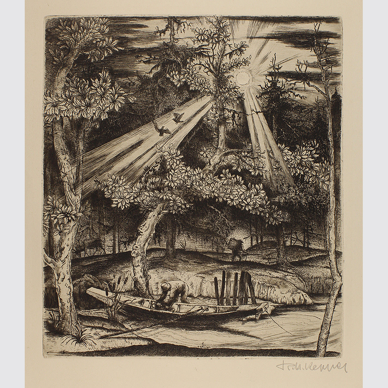 Franz Karl Renner: Anlegestelle im Waldstück. Sehr schöne Originalradierung, unten rechts etwas undeutlich signiert, wohl Franz Karl Renner. Abbildungsformat: 28 x 24,5 cm. Zustand: außerhalb der Darstellung an den Rändern Klebereste von ehemaliger Montage (vorn und hinten), ansonsten guter Zustand der schönen Arbeit. Die Arbeit dürfte aus den 20er Jahren stammen.
