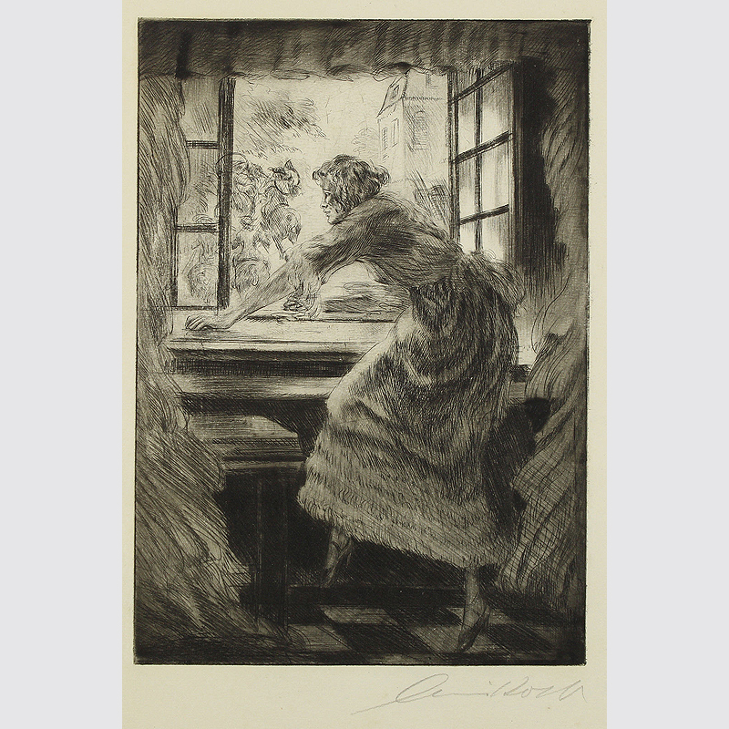 Alois Kolb: Blick aus dem Fenster. Originalradierung, unten rechts mit Bleistift von Kolb signiert. Entstehung um 1910. Abbildungsformat: 18,5 x 12,8 cm. Blattformat: 27 x 20 cm. Schöner Zustand.